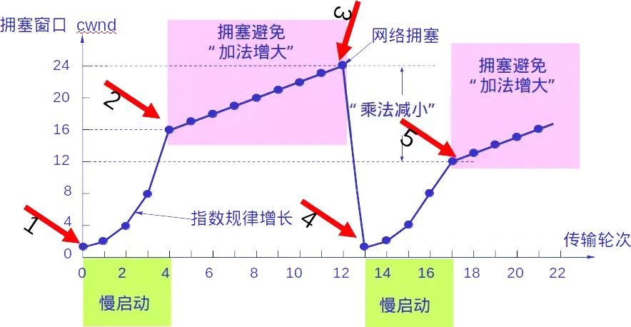 和慢启动一样,如果出现丢包事件,TCP发送方将ssthresh(慢启动阈值)设置为cwnd/2(加法增大, 乘法减小) 发生由超时引起的丢包事件,拥塞避免和慢启动处理的方式相同。即TCP发送方将