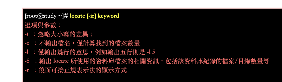 updatedb:根據 /etc/updatedb.conf 的設定去搜尋系統硬碟內的檔名,並更新 /var/lib/mlocate 內的資料庫檔案find