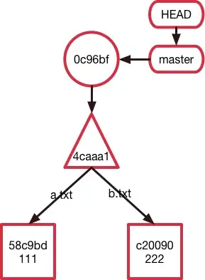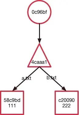 3. 当我们commit完成之后,Git仓库里面多出来两个object。这里我们遇到了第二种Gitobject类型——tree,它将当前的目录结构打了一个快照。从它储存的内容来看可以发现它储存了一个目录结构(类似于文件夹),以及每一个文件(或者子文件夹)的权限、类型、对应的身份证(SHA1值)、以及文件名。此时的Git仓库是这样的(树对象记录了结构和blob索引):
