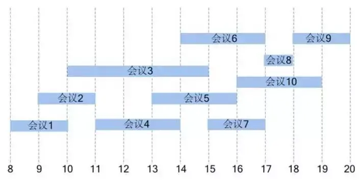 柯南的学校最近有很多领导来视察,学校需要安排许多会议,但是学校只有一个会议室,老师们想要知道最多能安排多少会议。老师们为了这件事焦头烂额,只好请来了柯南帮忙。请问柯南应该用什么办法来计算呢?