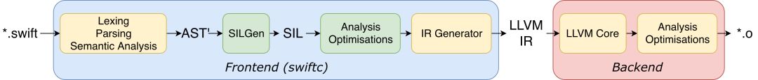 Swift语言也是基于LLVM架构的,你可以看到与现有Objective-C语言有很多相似之处,有相同的后端结构,前端的工作流程也基本类似,词法分析,标记,构建AST,类型检查,主要区别在于生成IR之前,AST之后,增加了SIL,它是AST和LLVM IR之间的另一种中间代码表示形式。