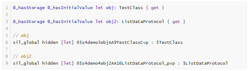 sil_global标记变量为全局变量,hidden标记只针对同一个Swift模块中的对象可见,这里明确定义了后面我们需要使用的两个对象obj和obj2。