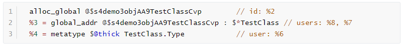 alloc_global 初始化全局变量的内存;// id: %2 这种类似注释语句在SIL中称为定位注释,标记id为2;