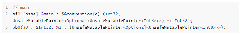 @main 表示方法的名字是main,SIL中所有标识符均以@符号开头;@convention(c) 很重要,它表示使用C函数的方式进行调用,convention这个标识用于明确指定当函数调用时参数和返回值应该如何被处理,除了这种方式还有: @convention(swift) 纯Swift函数的默认调用方式 @convention(method) 柯里化③的函数调用方式 @convention(witness_method) 协议方法调用,它等同于convention(method)除了在处理范型类型参数时 @convention(objc_method) Objective-C方式调用;
