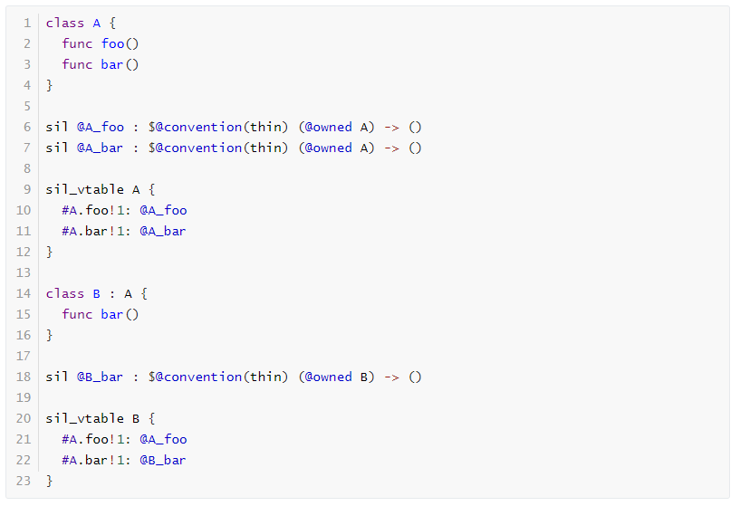 VTable用来表示类对象方法的动态派发(dynamic dispatch),如果看到SIL代码中出现class_method 和 super_method,这些都是通过sil_vtable进行追踪的;sil_vtable中包含类对象中每个方法的映射,包括从父对象继承的方法;