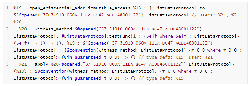 协议有函数定义:witness_method 通过查sil_witness_table表获得函数指针,这行也是一个thunk函数,通过:分割好几个部分,前面提到它的规则是方法名是连接在原始方法实现之前,所以调用的是@convention(witness_method: ListDataProtocol),通过查找关键字witness_method: ListDataProtocol,你能看到witness的函数实现;