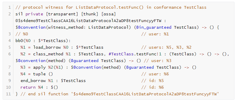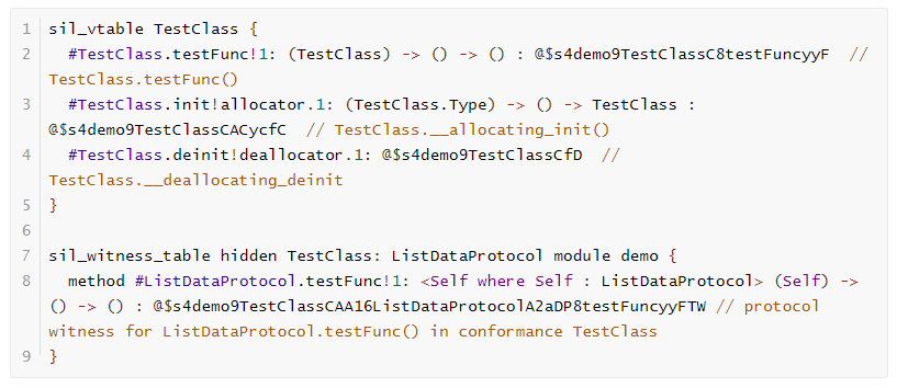 此函数是witness_method: ListDataProtocol的实现,内部使用class_method查找和调用,最终指向sil_vtable中的方法,调用到#TestClass.testFunc。