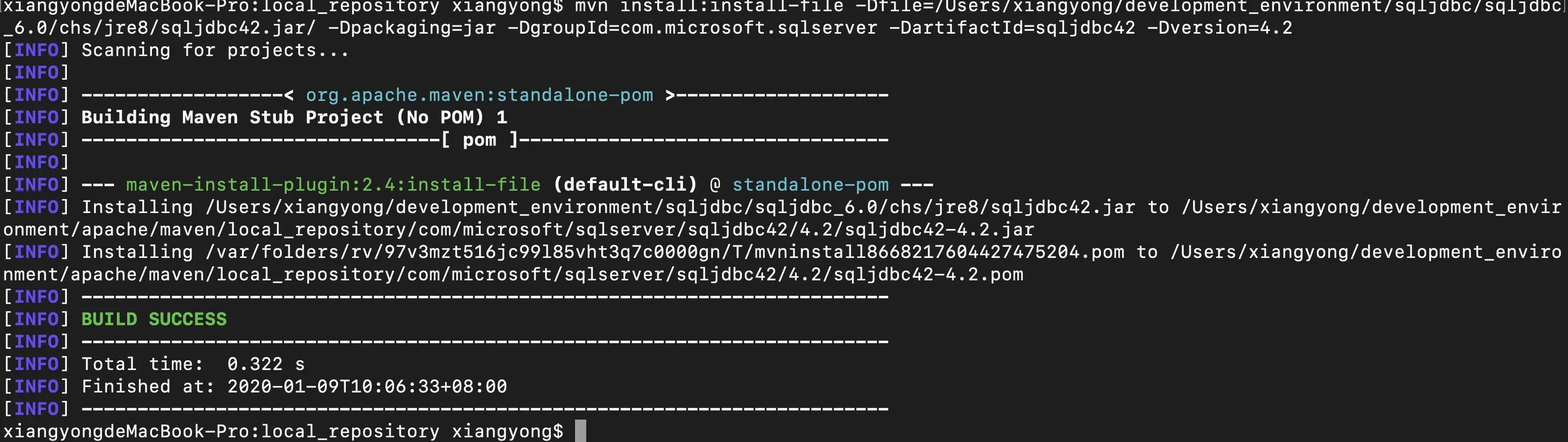 其中-Dfile参数对应你下载后本第sqljdbc42的jar包绝对路径位置 后面几个参数分别对应pom中的groupId,artifactId,version