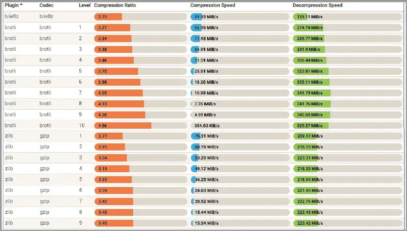 评价压缩算法时,我们重点看两个指标:压缩率和压缩速度。上图中可以看到,无论用gzip 9个压缩级别中的哪一个,它的压缩率都低于brotli(相比gzip,压缩级别它还可以配置为10),压缩速度也更慢。