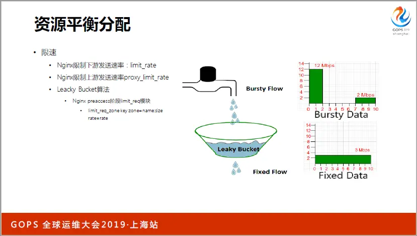 再来看资源的平衡分配。为了公平的对待连接、用户,服务器会做限速。比如下图中的Leacky Bucket算法,它能够平滑突增的流量,更公平的分配带宽。