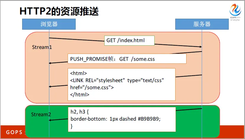 比如 index.html 文件中包含<LINK href=”some.css”>,在HTTP/1中,必须先下载完index.html,才能去下载some.css,这是两个RTT的时间。但在HTTP/2中,服务器可以通过2个stream,同时并行传送index.html和some.css,节约了一半的时间。