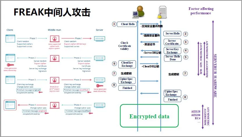 TLS1.2有什么问题呢?最大问题就是,它支持古老的密钥协商协议,这些协议现在已经不安全了。比如2015年出现的FREAK中间人攻击,就可以用Amazon上的虚拟机,分分钟攻陷支持老算法的服务器。