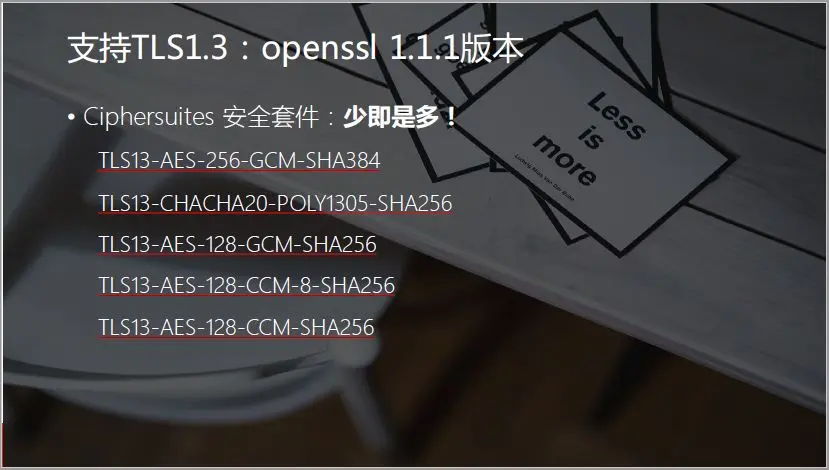 TLS1.3针对这一情况,取消了在当前的计算力下,数学上已经不再安全的非对称密钥协商算法。在Openssl的最新实现中,仅支持5种安全套件:
