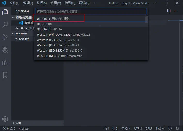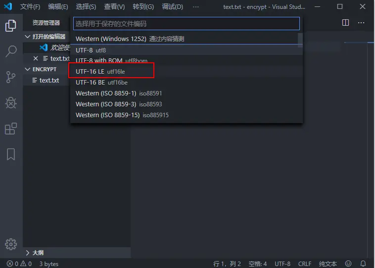 点击右下方的UTF-8,并选择“通过编码保存”,选择“UTF-16 LE”