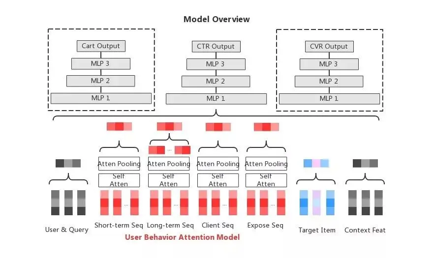 数据与特征: 端上点击序列的建模相对中短期序列中的点击行为有几个差异,一是获取用户的点击行为更加实时,平均rt从分钟级降到ms级;二是端上能获取到更加详细的用户行为,用户在详情页各个区块的停留时间,点击了哪些按钮;三是没有对该序列做query相关性的过滤,是希望从跨类目行为引入一些有用信息,作为做中短期序列的进一步补充,而不是重复;用户的行为从instance_level来讲,每一个行为都有一定的重要性,但是从feature_level来讲,每个行为的重要性也取决于品牌、店铺、term等特征与目标商品的匹配程度,不仅仅在于强调行为与query的类目预测一致;
