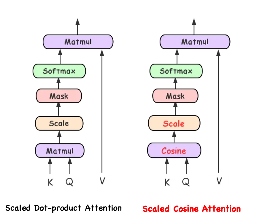 我们采用了cosine + scale up代替原来的点乘+scale down(也可以通过加入layer norm),来计算K和Q的相似度,提升softmax logits输出值的区分度。因为在套用原来的self-atten时,我们发现了一些问题:(1). softmax logits值非常小,导致atten的权重一直处于均值状态;(2). atten结构出现梯度弥散,导致几乎不能被学习。我们的CTR模型embedding从0初始化,而不是随机初始化,过小的梯度导致self atten很难被学习。为此,我们使用cosine值代替点乘,计算K与Q的距离。如下图所示: