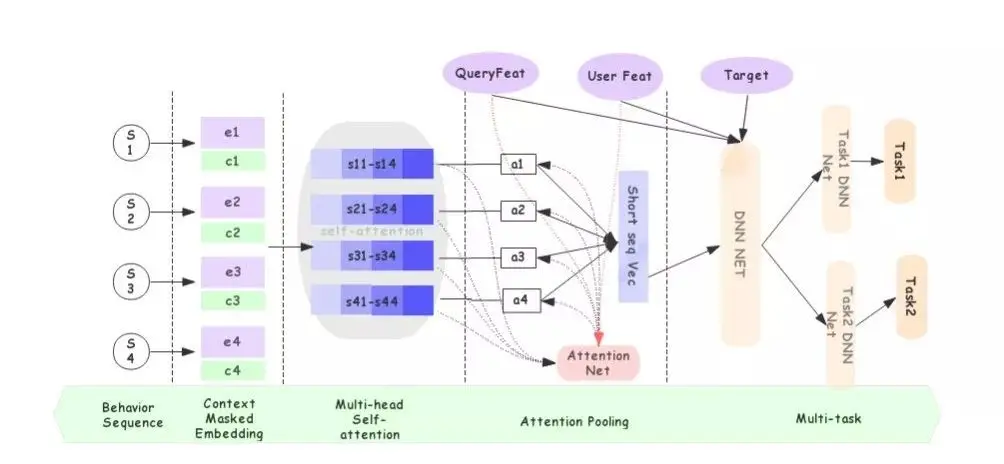 整个中短期行为建模的模型结构如下图所示,self atten + query atten pooling: