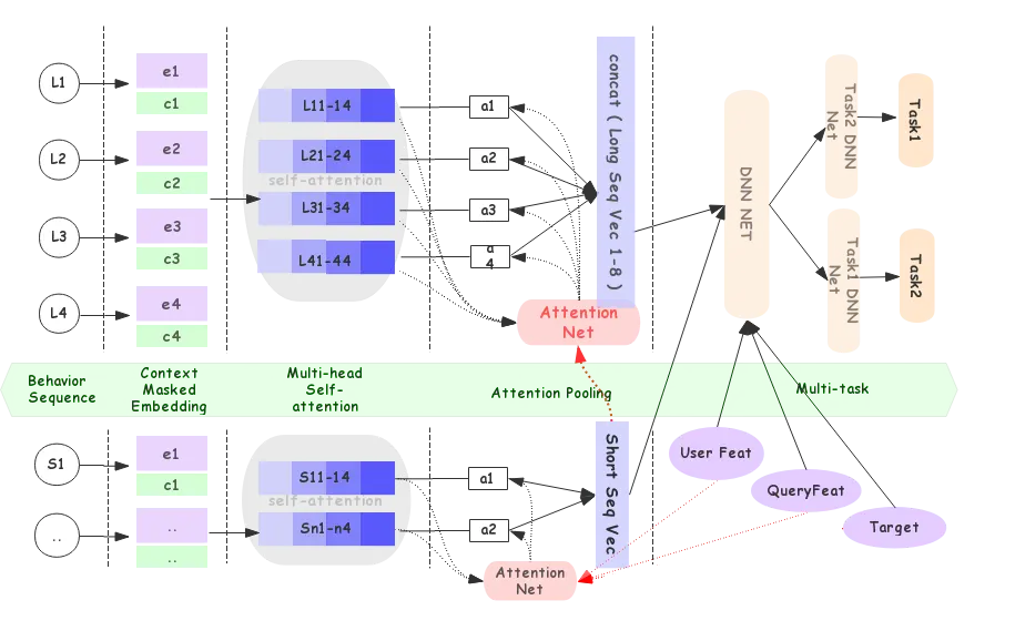 数据与特征: 在去年星舰项目中,我们针对用户中短期,不同行为类型的行为进行了全局建模,该序列包含了用户全网实时的点击 加购 收藏 购买等行为。鉴于用户历史行为非常丰富,而我们的序列长度有上限(L_max=50),因此我们通过query的预测类目来甄选出与当前意图类目更相关的历史行为。用户主动输入query,这是搜索和推荐最大的区别。关于query方面,query理解团队已经做了大量的工作。在此,我们利用query理解的结果,使用query的预测叶子类目,对用户行为序列做筛选。
