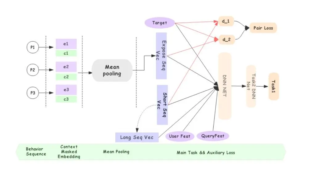 模型结构: 曝光序列的建模方式比较简单,通过mean pooling得到曝光表达。但是为了让正向表达和曝光表达有所区分,我们先分别计算正向表达和曝光表达与目标商品的距离d1和d2,并添加辅助loss使得两个距离之间符合以下条件:当目标商品对应是正样本时 d1 + M < d2;当目标商品对应是负样本时 d1 > d2 + M。建模方式类似下图方式。