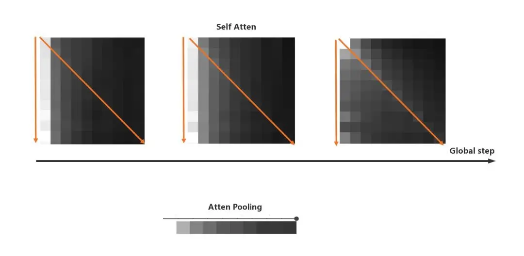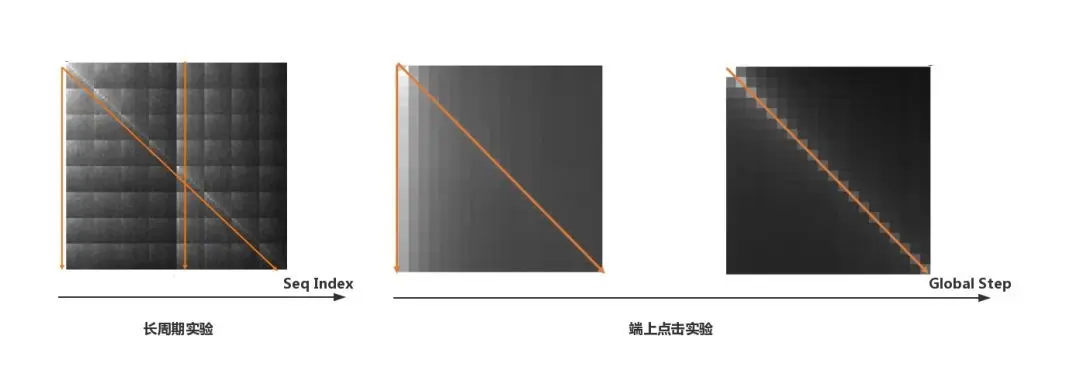 为了分析长周期是否能达到去年同季个性化冷启动的作用,我们做一个简单的实验:把长周期的8个季度序列拼在一起,作为一个sequence序列,用self atten来观察季度之间所有序列的的关联性。如图所示:横轴是seq_index,颜色越浅表示权重越大,可以看到类似在中短周期行为序列里的现象,最终呈现的是同时受到商品关联和行为信息影响的attention map图,第一列是位置靠前的行为比较重要,第五列是和当前季度相同的行为,重要性次之,对角线表示与自己的atten值。