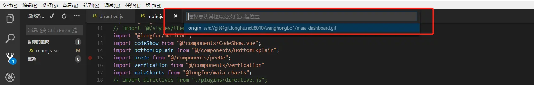 4、确定暂存后再点开这三个点里面 选择拉取自 (git pull),会出来所有的分支,然后选择要拉取的分支;如果只有一个分支的话,三个点里边选择拉取就好。