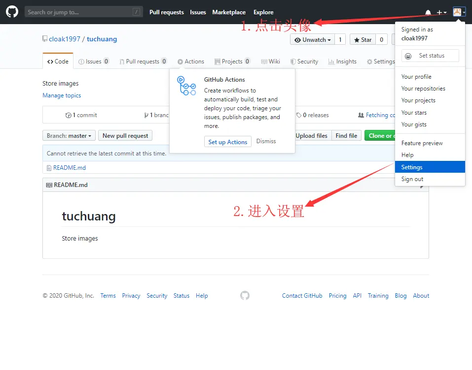 此时已经创建了仓库,点击右上角头像,然后进入设置;