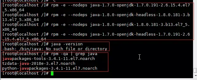 命令格式:rpm -e --nodeps xxx-openjdk-yyy 具体如下: