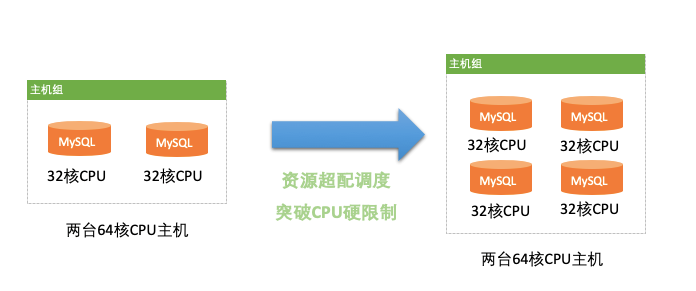 企业客户购买RDS 专属主机组主机后,100%专属该资源,不需要再为具体数据库实例付费,可根据具体业务场景超配分配CPU,最大化利用物理CPU计算效能。如下两台64核CPU主机组件高可用主机组,可分配2套32核CPU RDS MySQL实例,根据业务访问特点,可超配主机组200% CPU资源,则可在同样的物理资源前提下分配出原来两倍的数据库实例。