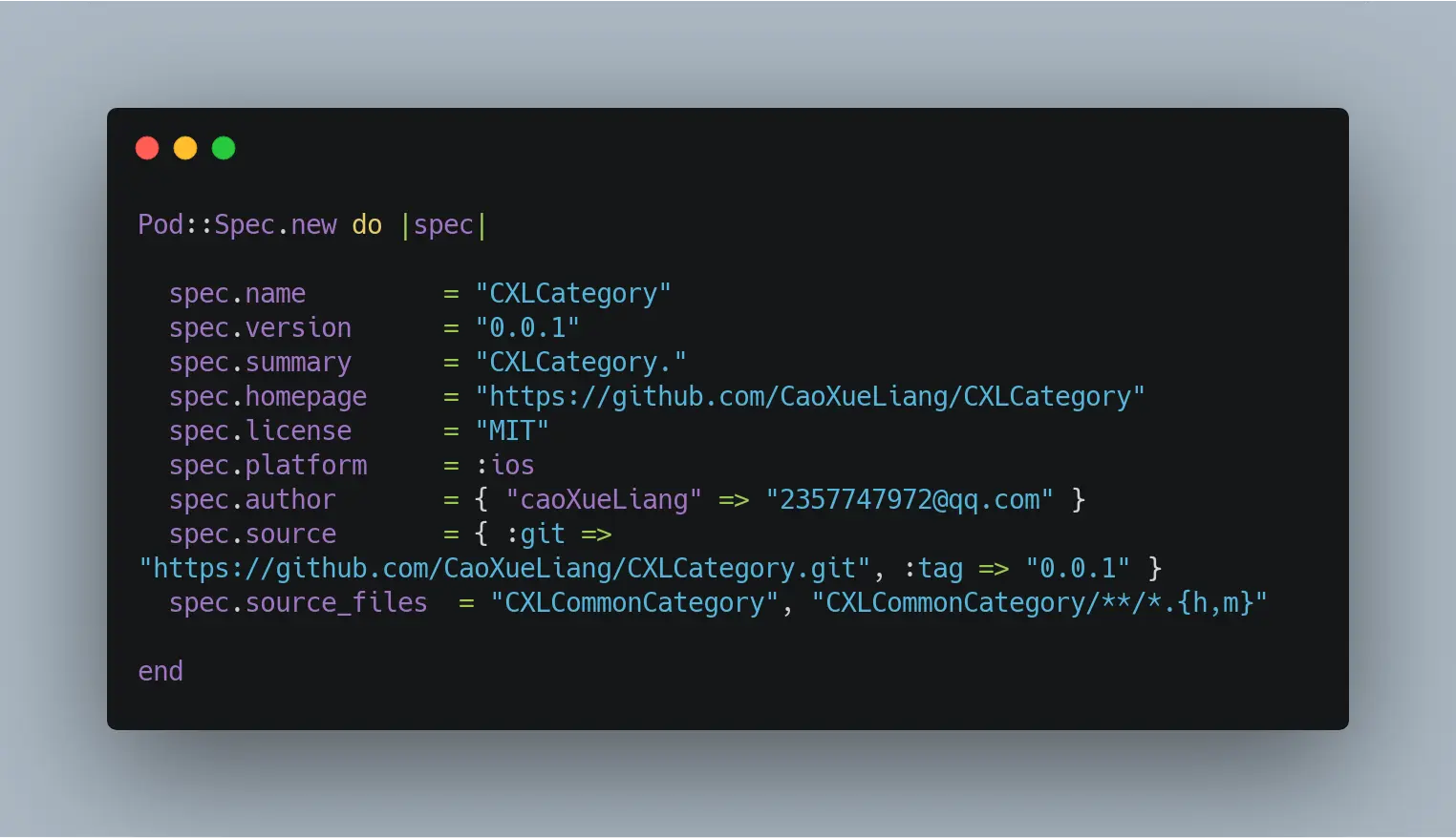创建成功后,用编辑器打开刚刚创建的CXLCategory.podspec文件,进行编辑。编辑最终如下图所示: