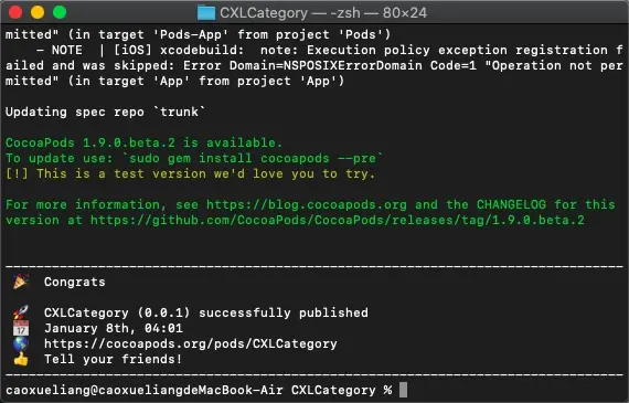 出现如下提示CXLCategory (0.0.1) sucessfully published,说明发布成功