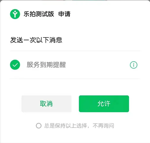 官方的的态度:将“总是保持以上选择,不再询问”勾选并点击允许,那么以后都默认同意订阅这条消息,不再提醒。这就这样确实是可以满足上面的需求,但是如果用户没有勾选或者不知道去勾选的情况下如何取解决这个问题呢?查阅了很多资料,好像都没有明确的解决办法,既然查不到相关的方法,那我就自己写一个方法。