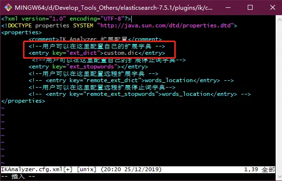 修改同目录下的IKAnalyzer.cfg.xml文件,为<entry key="ext_dict">属性指定自定义的词典;
