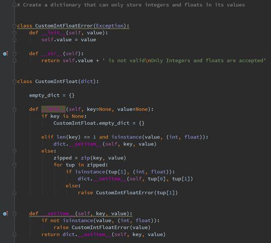 在字典中设置键和值时会调用__setitem __这种魔术方法。一旦构造了CustomIntFloat 对象,如果用户尝试添加非int或float类型的值,则将引发相同的CustomIntFloatError 异常。在下面添加了一个代码段,该代码段显示了如何按预期设置键和值。