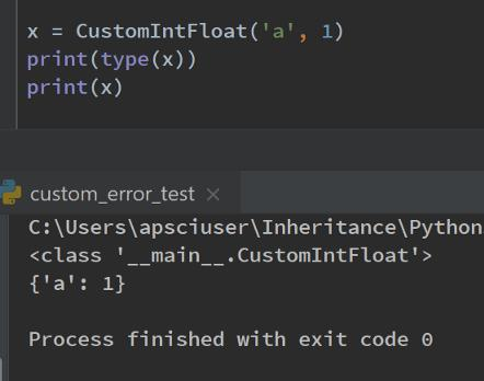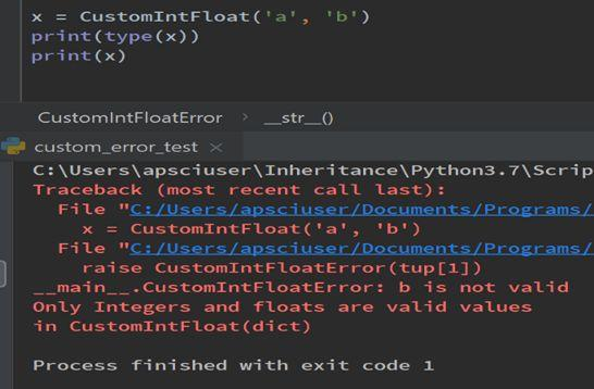 因此,此自定义错误类需要__ init __和__str__魔术方法。在此实例中,采用传递的值,并将其设置为CustomIntFloatError类中的属性值。