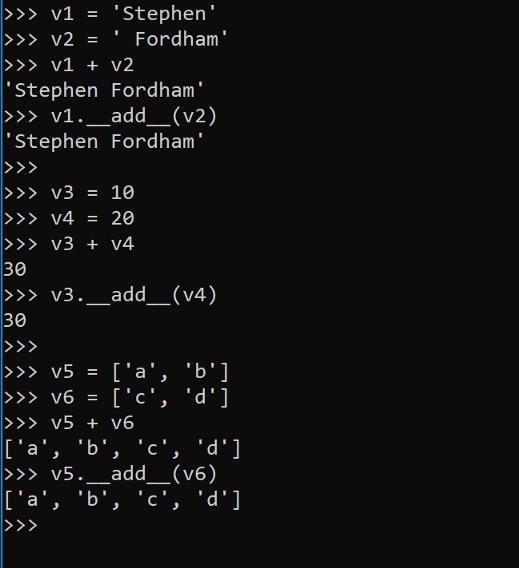 像+,-,/和*这样的运算符是多态方法。如下面的Python prompt所示,加号(+)是多态的,可用于连接字符串,将整数和组合列表相加。这是可行的,因为所有这些类型(str,list和int)在各自的类中都有一个add方法。Python只是将+符号转换为对调用对象的__add__方法(请参见下面的示例)。