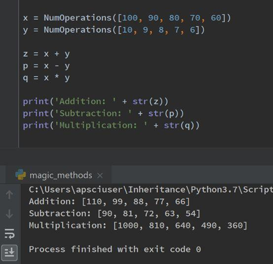 更详细地说,魔术方法__sub__接受2个NumOperations对象,并将它们的列表压缩在一起,迭代其他对应的元组列表。从第一个元组中减去第二个元素,并将该值附加到名为minuslst的新列表中,并将其作为参数传递给NumOperations构造函数。