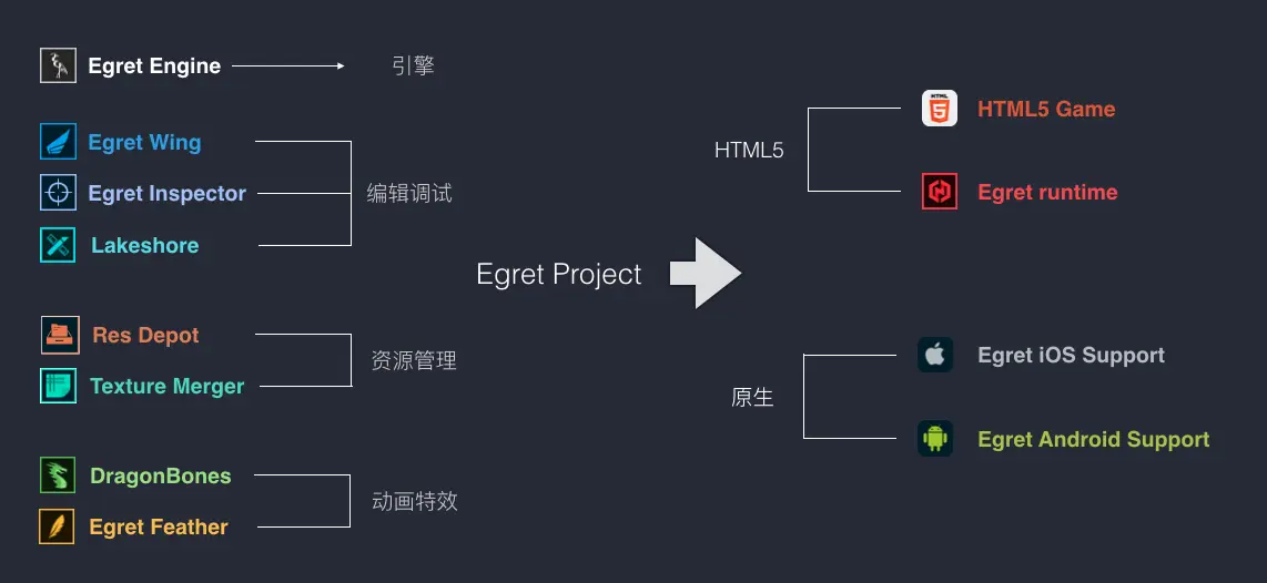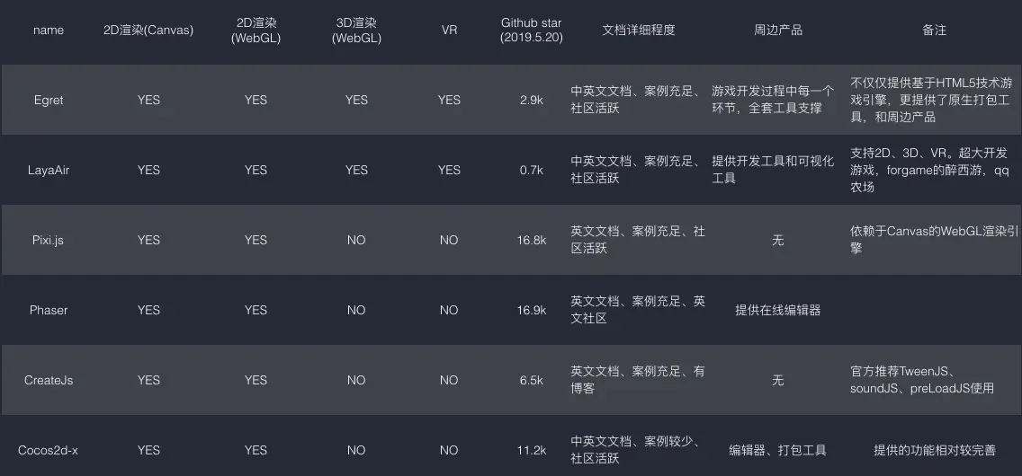 从上面的一张主流游戏框架引擎对照表,可以很明显的找到Egret相对于其他游戏动画引擎的优点: