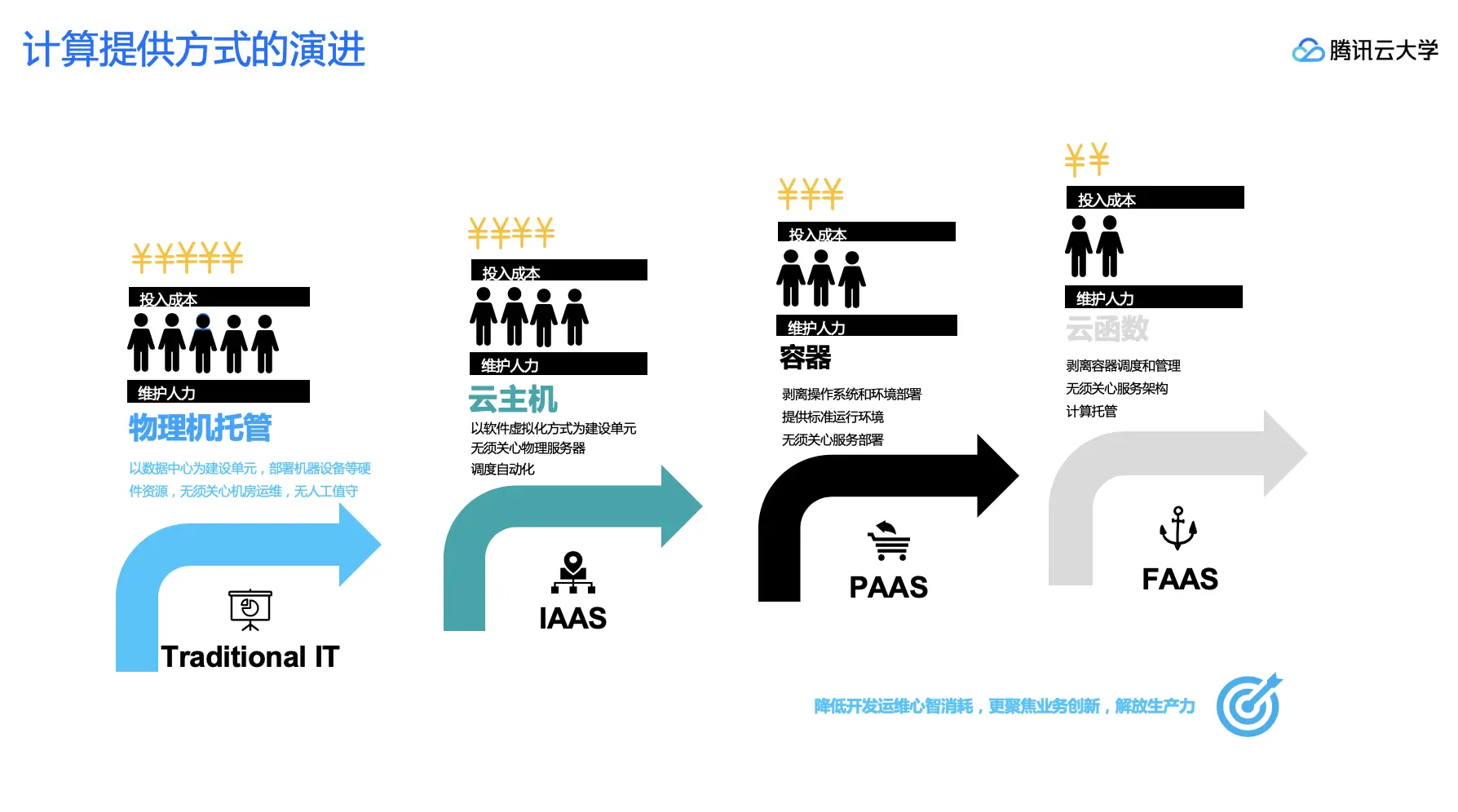 FaaS是Serverless发展的重点时期。在前云计算的时代,用户需要先去买服务器,开通网络,安装操作系统,安装运行时,再运行应用代码包;IaaS的时代,需要先申请虚拟机,安装操作系统,安装运行时,再运行应用代码包;PaaS的时代,需要先申请虚拟机,关联PaaS系统,再运行应用代码包。而在FaaS的时代,用户直接提交代码包就可以运行了。就好像现在手机应用商店下载一个应用就可以使用,不需要像当年跑到应用的官网,按手机架构下载代码包,拷贝到手机上,再进行安装才可以运行。