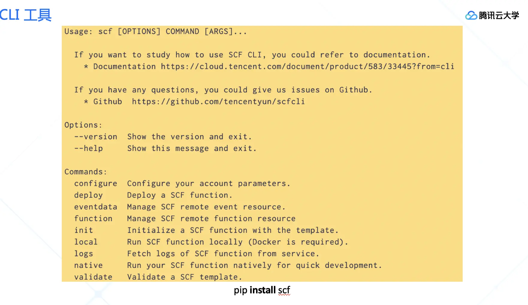 腾讯云 Serverless 本地开发工具(SCF CLI)以开源项目的形式维护,目的在于让用户方便的实现函数打包、部署、本地调试,也可以方便的生成云函数的项目并基于 demo 项目进一步的开发。SCF CLI 通过一个函数模板配置文件,完成函数及相关周边资源的描述,并基于配置文件实现本地代码及配置部署到云端的过程。