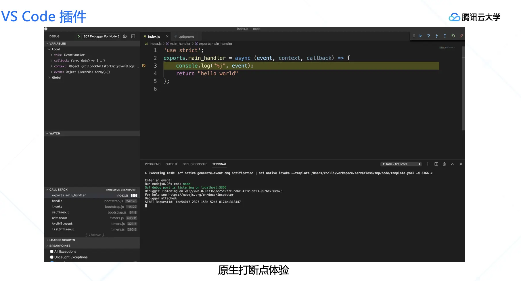 在开发过程中,开发者会选取自己熟悉的 IDE 代码编辑器进行代码编写。为了便于更快速直观的进行本地开发和调试,腾讯云 VS Code 插件支持一键调试的能力。首先,可以打开刚创建函数的文件目录,在插件中自动识别这个函数。之后可以通过 F9 进行断点,F5 启动调试能力。函数调试过程中的输出会打印在 terminal 中,并且支持单步调试,查看变量和堆栈等信息。