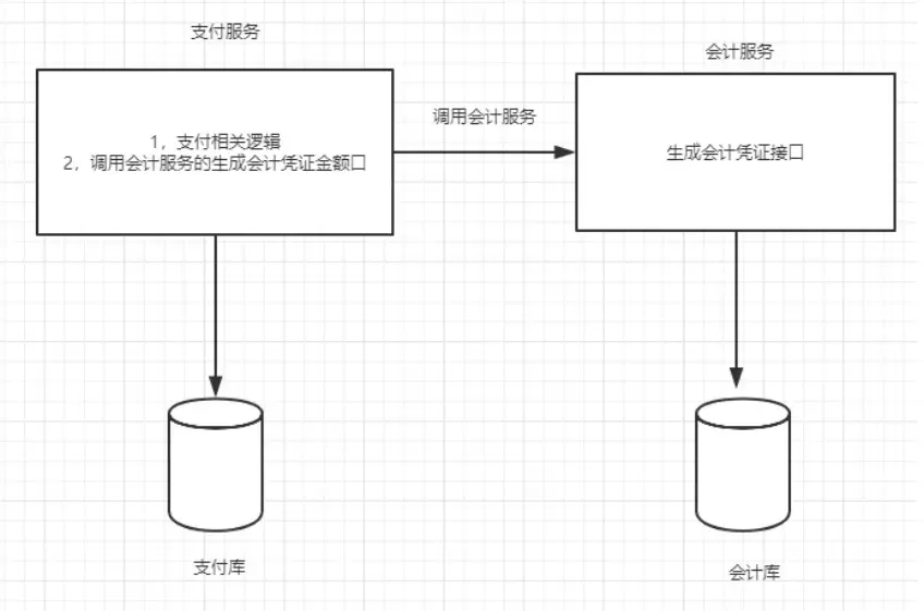 本地消息表方案最初是ebay提出的,其实也是BASE理论的应用,属于可靠消息最终一致性的范畴。这里以支付服务和会计服务为例展开介绍本地消息表方案,大概流程是这样子:用户在支付服务完成了支付订单支付成功后,此时会调用会计服务的接口生成一条原始的会计凭证到数据库中,如图1所示。这里必须明确:支付服务处理完订单支付等逻辑后,此时若直接调用会计服务生成会计凭证数据的接口肯定会遇到分布式事务的问题。