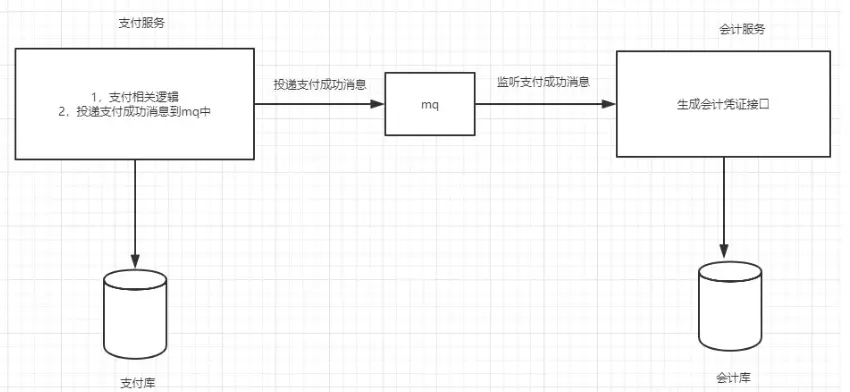 因为用户完成支付后,此时得立马给用户一个支付的反馈,要做的就是提醒用户支付成功。因为会计服务生成的会计凭证保存到数据库的过程中可以对用户透明,用户也无需知道有这么一个流程,为了提高响应速度和解耦,因此可以引入mq来做到异步生成会计凭证,即用户完成支付订单支付后,此时可以将消息投递到mq中,然后会计服务再去监听mq消息去处理消费逻辑。此时如图2: