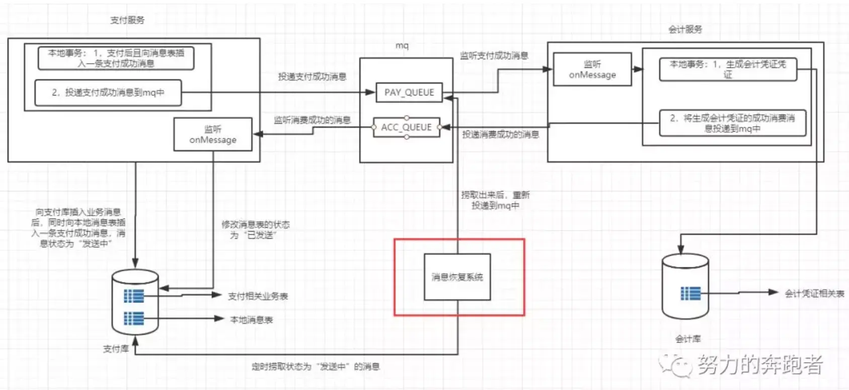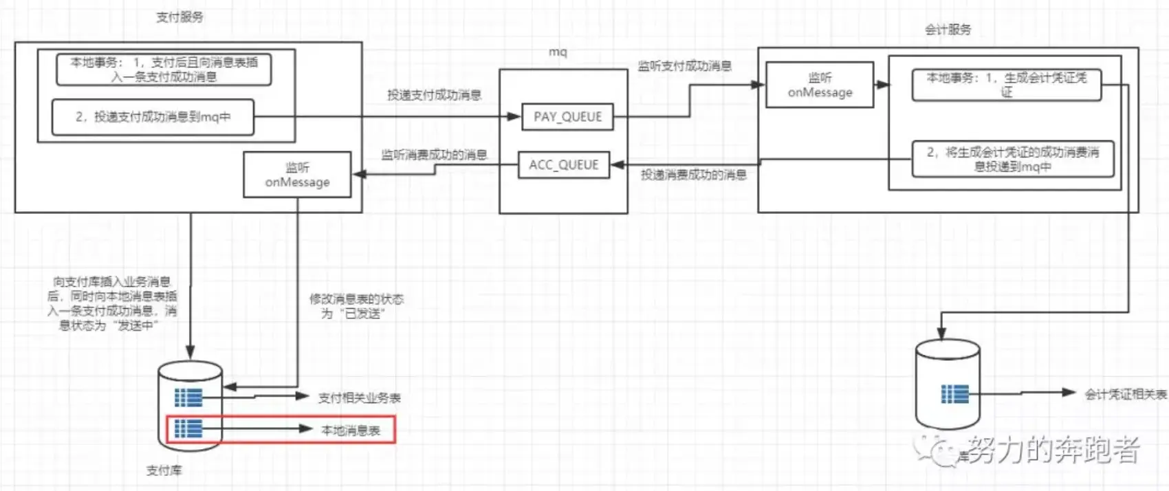 1)在支付库中引入一张消息表来记录支付消息,即用户支付成功后同时往这张消息表插入一条支付成功的消息,状态为“发送中”。注意支付逻辑和插入消息表的代码要包裹在一个事务里面,这里保证了本地事务的强一致性。即支付逻辑和插入消息表的消息组成了一个强一致性的事务,要么同时成功,要么同时失败。
