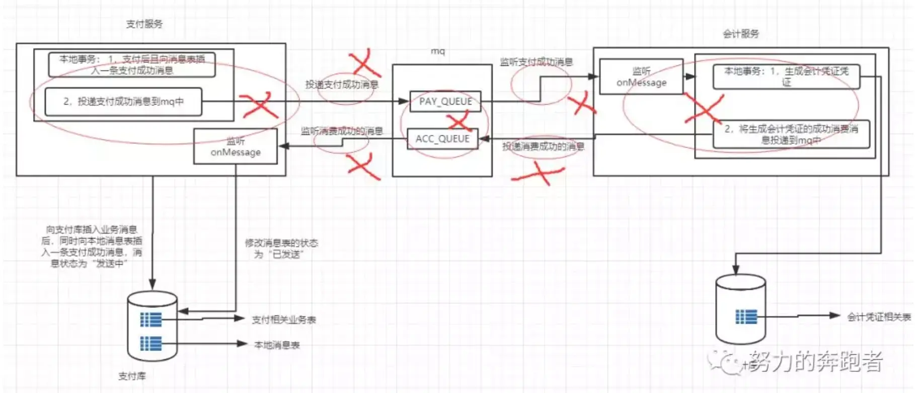 以上是引入本地消息表后的正常的业务流程,前文分析过生产者,mq和消费者三个环节中都可能弄丢消息,即图4中的红框处可能会造成消息丢失。