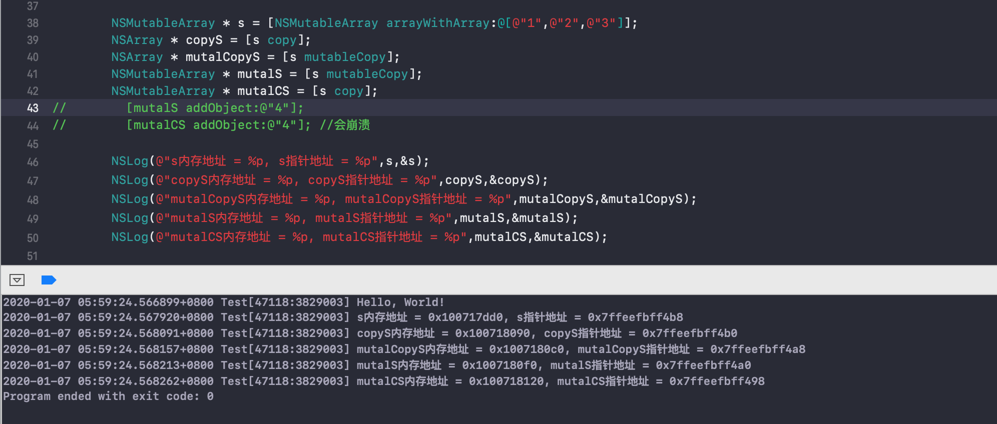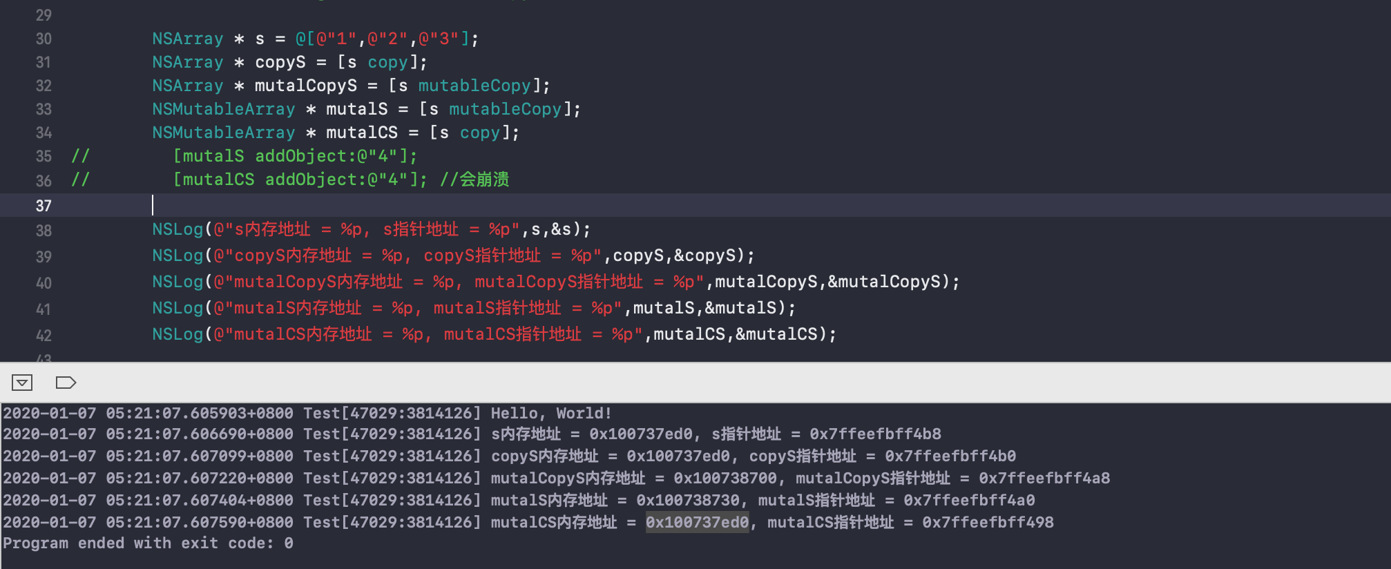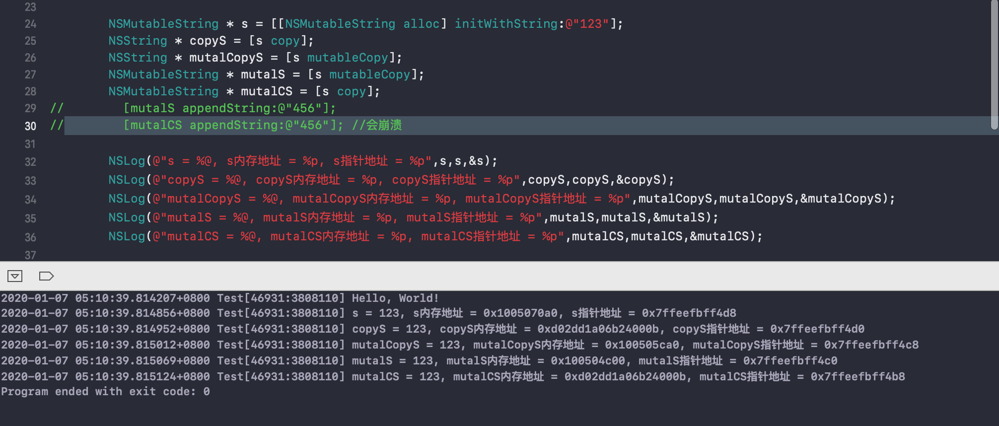 4.copy返回是不可变对象,mutalCopy返回的是可变对象,所以在进行[mutalCS appendString:@"456"]操作时,会返回Attempt to mutate immutable object with appendString:的错误。