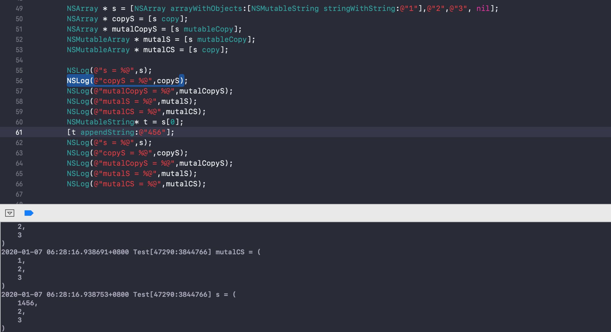 运行时,mutalCopyS是NSMutableString类型,mutalCS是NSString类型。