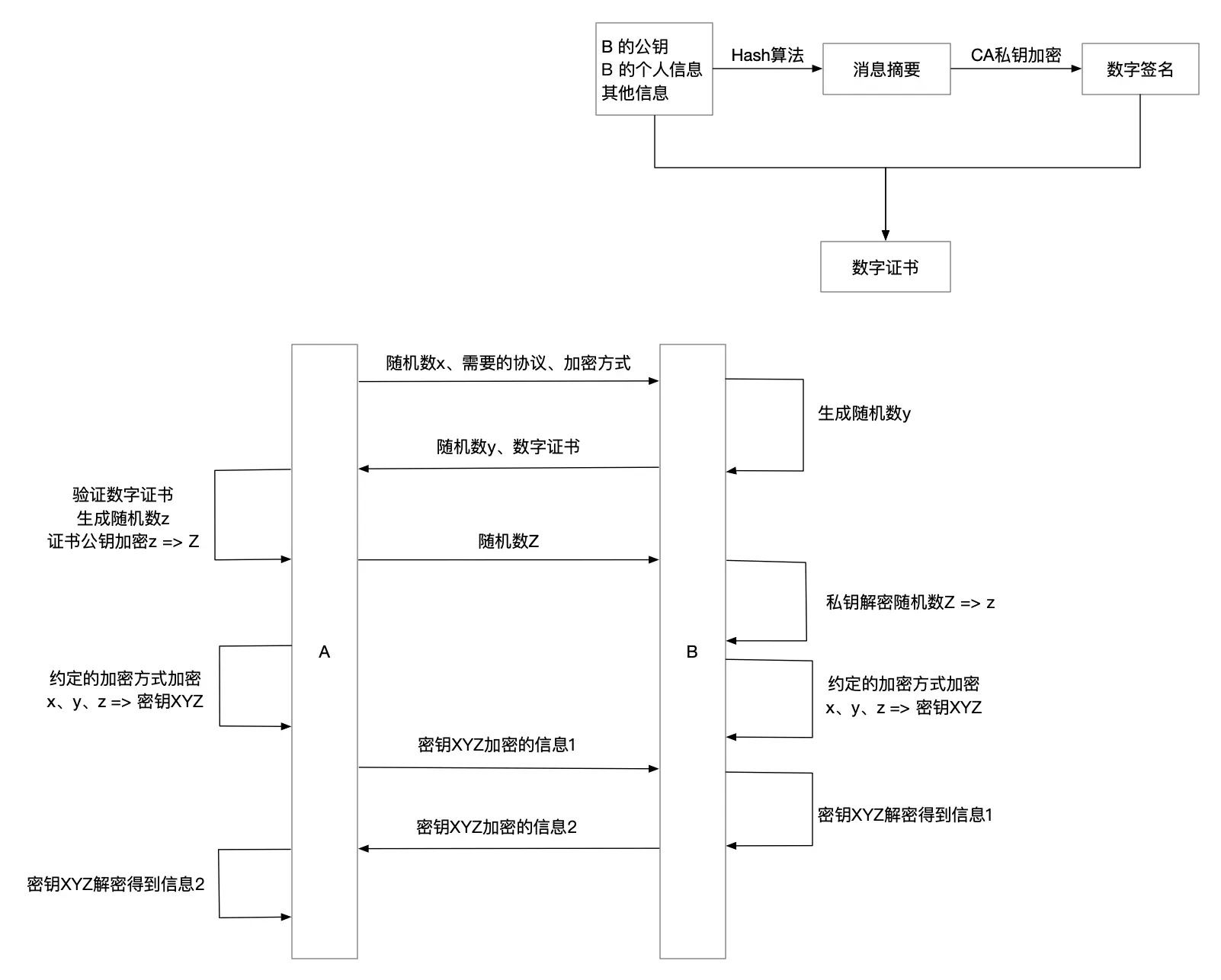 但是这里面有个问题,如果第二步中,这个鸽子带的盒子1被 C 换成盒子2,那么 A 拿到的盒子2并将纸条放到盒子2中,纸条也就被 C 拿到了,这时候 C 再将纸条放到盒子1 中,发回给 B,所以我们需要保证 A 能够知道这个盒子是可靠的,没有被替换过,这就需要一个权威的人 X 来给这个盒子打上特殊标记,不被信任的人是无法标记盒子的,这样 A 就能识别这个盒子了。X 就是一个权威认证机构。
