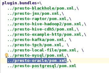 config.properties 文件在“presto/presto-main/etc”路径下,在plugin.bundles 下添加“../presto-oracle/pom.xml”。