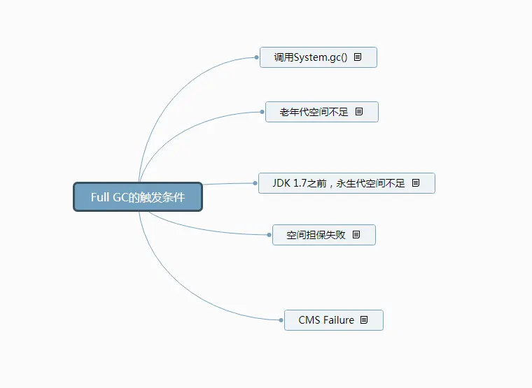 对于 Minor GC,其触发条件非常简单,当 Eden 空间满时,就将触发一次 Minor GC。 而 Full GC 则相对复杂,有以下条件: