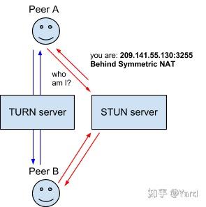 NAT 的中继穿越方式 Traversal Using Relays around NAT (TURN) 通过 TURN 服务器中继所有数据的方式来绕过“对称型 NAT”。你需要在 TURN 服务器上创建一个连接,然后告诉所有对端设备发包到服务器上,TURN 服务器再把包转发给你。很显然这种方式是开销很大的,所以只有在没得选择的情况下采用。